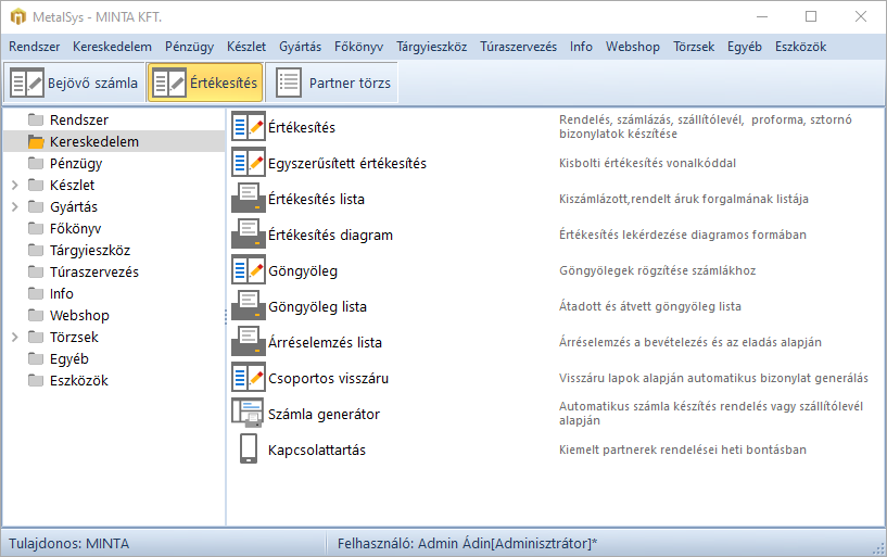 Bejelentkezés után a főmenü jelenik meg, innen érhetjük el a program ablakait.